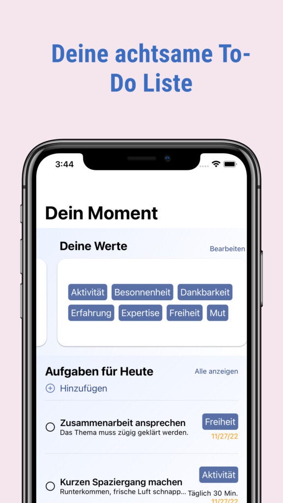 Integrierte Achtsamkeitsübungen und Meditationen: Neben der Aufgabenliste bietet die App eine Reihe von Achtsamkeitsübungen und geführten Meditationen, die speziell darauf ausgelegt sind, Dich in stressigen Momenten zu unterstützen. Diese Übungen sind angelehnt an die Acceptance-Commitment-Therapie (ACT), die darauf abzielt, psychologische Flexibilität zu fördern und ein sinnerfülltes Leben zu führen.